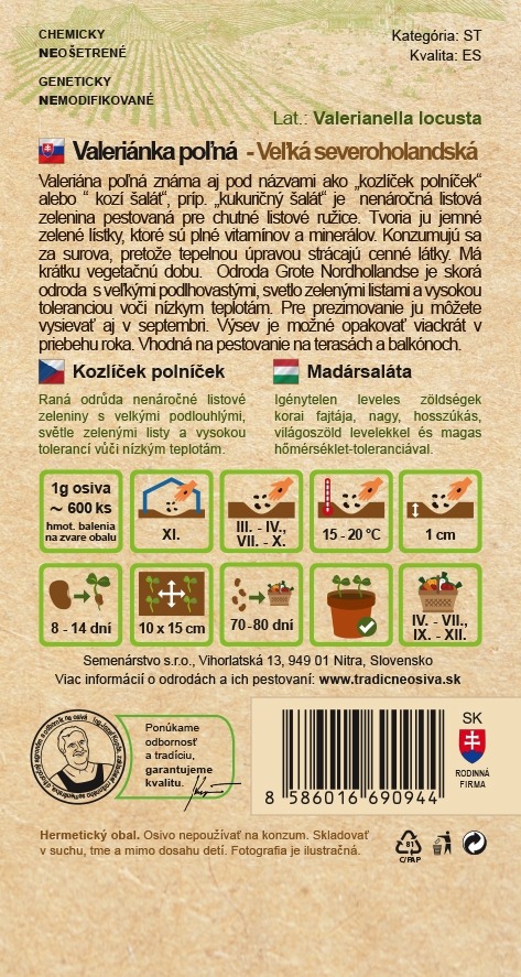 Valeriánku polní Grote Noordhollandse vyséváme do pařeniště v listopadu nebo přímo do půdy od března do dubna a od července do října. Semena vyséváme do hloubky 1 cm a dodržujeme doporučený spon 10 x 15 cm. Teplota půdy při výsevu by měla být 15 - 20 °C. Tato odrůda dobře odolává nízkým teplotám a je vhodná pro pěstování i v nádobách na balkonech a terasách. Sklízíme listové růžice od dubna do července a od září do prosince.
