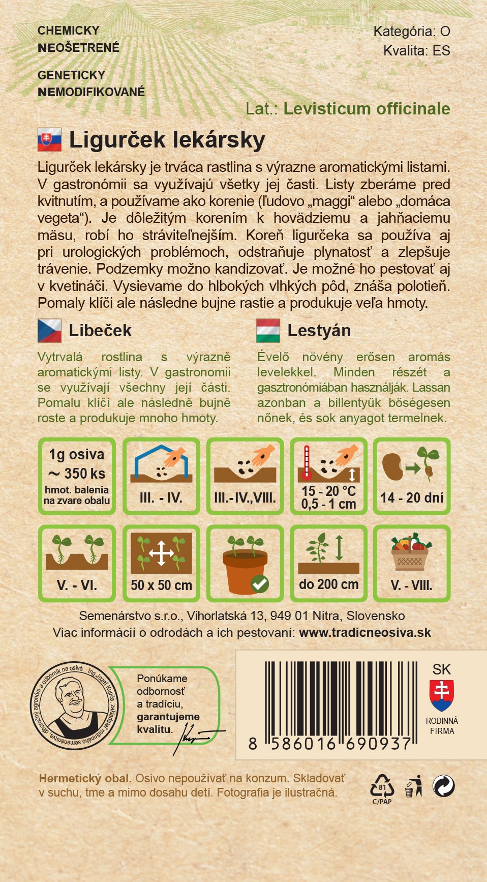 Libeček lékařský je vytrvalá rostlina s výrazně aromatickými listy. V gastronomii se využívají všechny její části. Listy se sbírají před květem a používají se jako koření, známé pod názvem „maggi“ nebo „domácí vegeta“. Libeček je důležité dochucovadlo k hovězímu a jehněčímu masu, které činí stravitelnějším. Kořen libečku se využívá i při urologických potížích, odstraňuje nadýmání a podporuje trávení. Podzemky lze kandovat. Je možné jej pěstovat i v květináči. Vyséváme do hlubokých vlhkých půd, přičemž snáší i polostín. Klíčí pomalu, ale následně bujně roste a produkuje velké množství zelené hmoty.