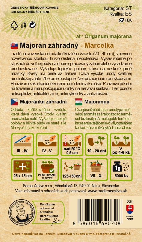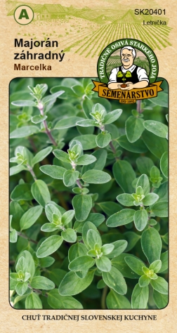 Majorán zahradní MARCELKA je odrůda keříčkového vzrůstu s výškou rostliny 20 - 40 cm. Má pevnou, rozvětvenou lodyhu, která je hustě olistěná a nevylehává. Semena vyséváme po špetkách do kvalitně zpracovaného záhonu nebo předpěstujeme sazenice, které vysazujeme na trvalé stanoviště. Rostlina je citlivá na jarní mrazy, proto jí vyhovují teplejší polohy. Květy jsou bílé s nádechem fialové. Listy sklízíme průběžně. Majoránka netrpí chorobami ani škůdci. Aromatickou nať využíváme jako koření do gulášů, zabijačkových specialit, k uzeninám a masu. Působí pozitivně na trávení a uklidňuje nervovou soustavu.