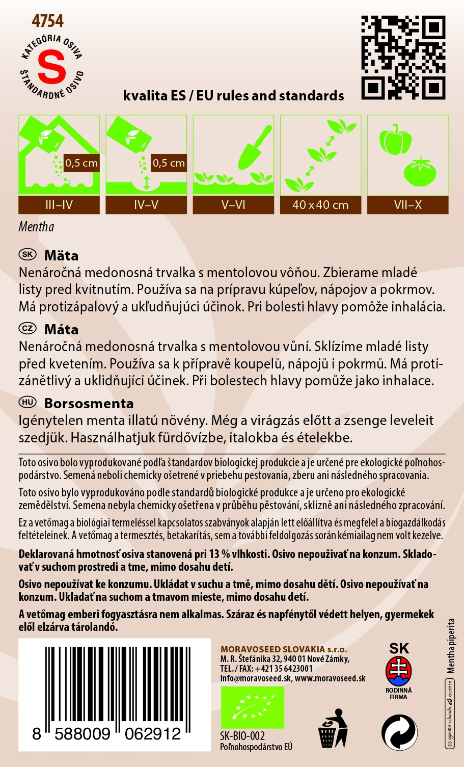 Máta peprná BIO se daří v polostínu, v humózní a mírně vlhké půdě. Během sezóny ji pravidelně seřezáváme, čímž podpoříme hustý růst a nové výhonky. Je vhodná i pro pěstování v květináčích nebo nádobách. Doporučuje se ji každé 2–3 roky přesadit, aby si zachovala sílu a intenzivní aroma. Na zimu ji lze přikrýt mulčem.