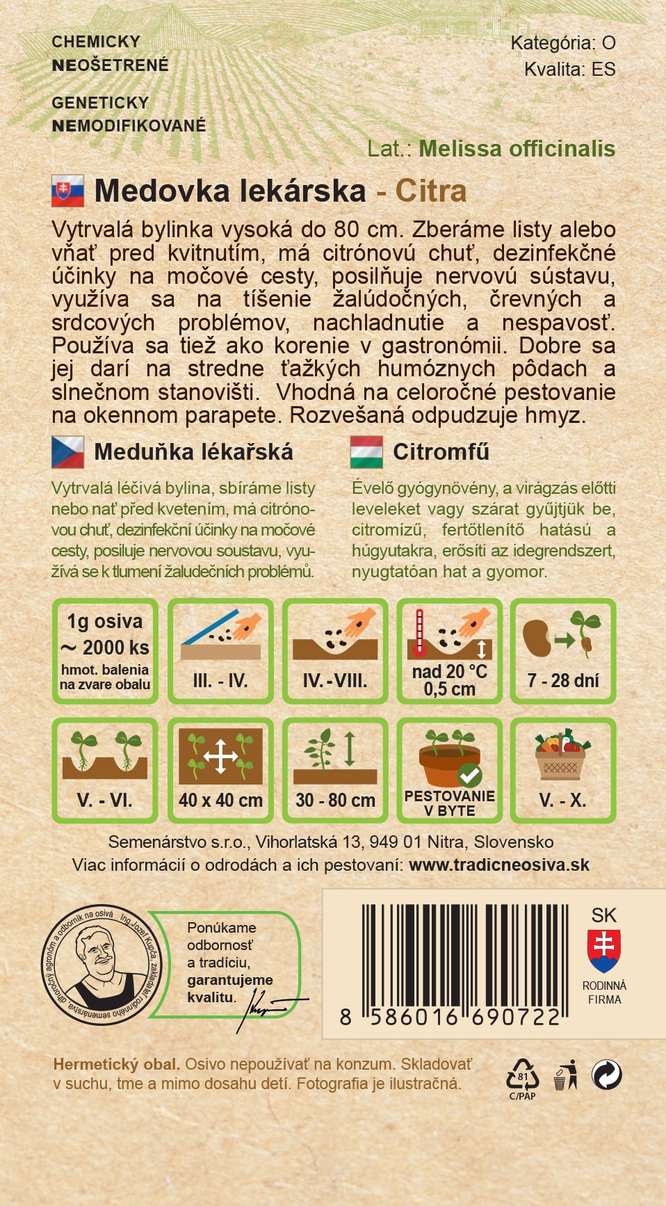 Meduňka lékařská Citra je vytrvalá bylinka dorůstající výšky až 80 cm. Sklízíme její listy nebo nať před květem, které mají jemnou citronovou chuť a řadu blahodárných účinků. Meduňka má dezinfekční účinky na močové cesty, posiluje nervovou soustavu a pomáhá při srdečních problémech, nachlazení a nespavosti. V gastronomii se využívá jako aromatické koření. Rostlině se daří ve středně těžkých humózních půdách a na slunných stanovištích. Je vhodná k celoročnímu pěstování v bytě na okenním parapetu. Zavěšená v domácnosti odpuzuje hmyz.