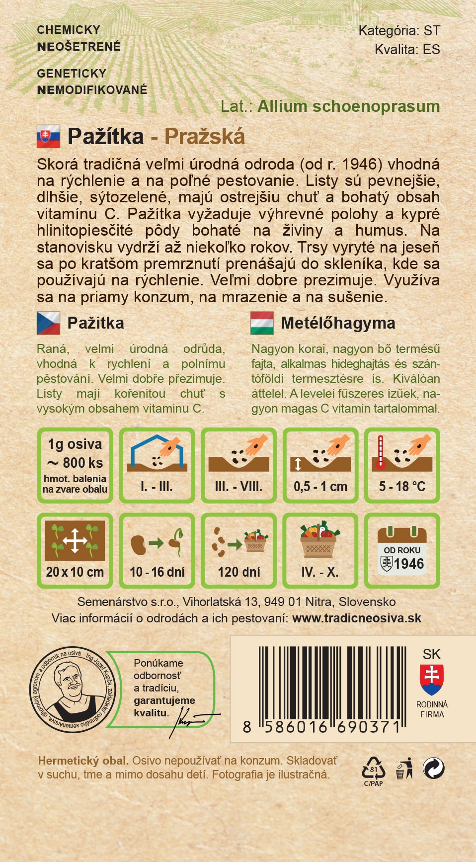 Pažitka Pražská je oblíbená vytrvalá bylinka s jemnou cibulovou vůní a svěží chutí, ideální do salátů, polévek, pomazánek či na dochucení pokrmů. Odrůda Pražská se vyznačuje rychlým růstem, jemnými dutými listy a výbornou schopností regenerace po řezu. Lze ji pěstovat po celý rok – na záhonu, ve skleníku i v květináči.