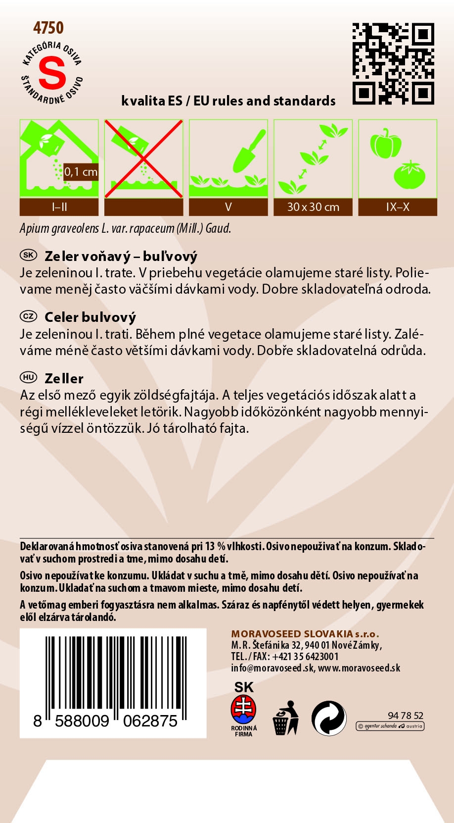Celer vonný – bulvový – MAXIM vyséváme od ledna do února do propustného substrátu. Přesazování na trvalé stanoviště probíhá od dubna do července. Vyžaduje pravidelnou zálivku a slunné stanoviště. Rostlinu doporučujeme hnojit hnojivem bohatým na draslík a fosfor. Sklizeň probíhá od července do prosince.