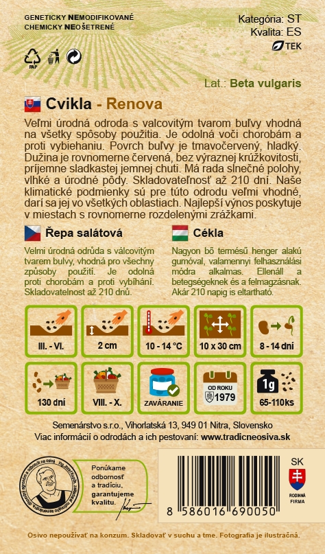 Červená řepa Renova patří mezi oblíbené odrůdy hlavně díky svému válcovitému tvaru bulvy, který je při zpracování velmi praktický. Pěstitelé ji oceňují také pro vysokou výnosnost a spolehlivý růst v běžných zahradních podmínkách. Dužina bývá tmavě červená, rovnoměrně zbarvená a bez výrazné kroužkovitosti. Velkou výhodou je i její jemně nasládlá chuť, která se hodí na vaření, pečení i nakládání. V kuchyni se dobře krájí na pravidelné plátky, což je praktické při konzervaci i přípravě salátů. Tato odrůda je vhodná pro přímou spotřebu i delší skladování. Při správné péči poskytuje kvalitní a všestranně využitelnou sklizeň.