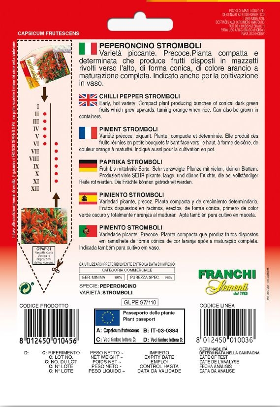 Chilli Stromboli vyséváme od února do května do hloubky 0,5 cm. Sazenice přesazujeme na trvalé stanoviště od května do července. Rostliny vyžadují slunné stanoviště a pravidelnou zálivku. Sklizeň probíhá od června do září, kdy plody dosáhnou optimální velikosti a barvy.