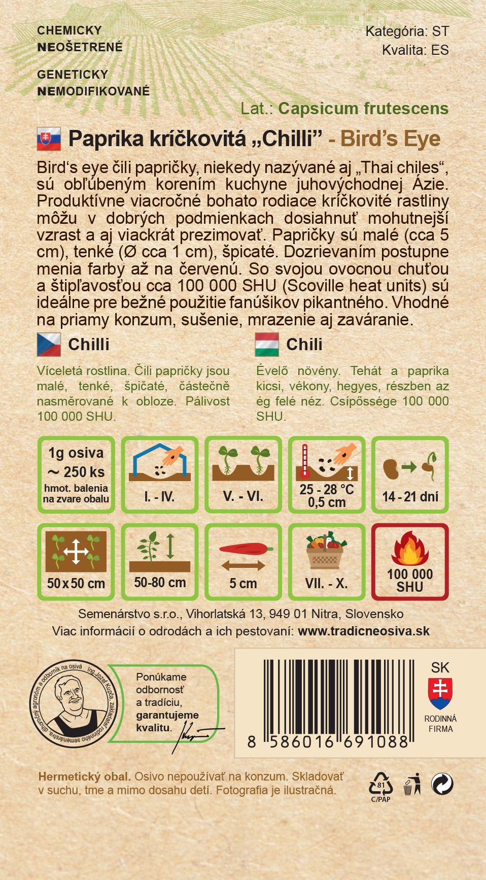 Chilli papričky Bird‘s Eye, známé také jako Thai Chiles, jsou oblíbeným kořením v jihovýchodní Asii. Jedná se o víceleté keříkovité rostliny, které při dobrých podmínkách bohatě plodí a dorůstají do výšky 50 – 80 cm. Plody jsou malé, špičaté, přibližně 5 cm dlouhé a 1 cm široké. Během zrání mění barvu ze světle zelené na jasně červenou. Jejich pálivost dosahuje až 100 000 SHU, což z nich činí intenzivní koření vhodné k přípravě různých pokrmů.