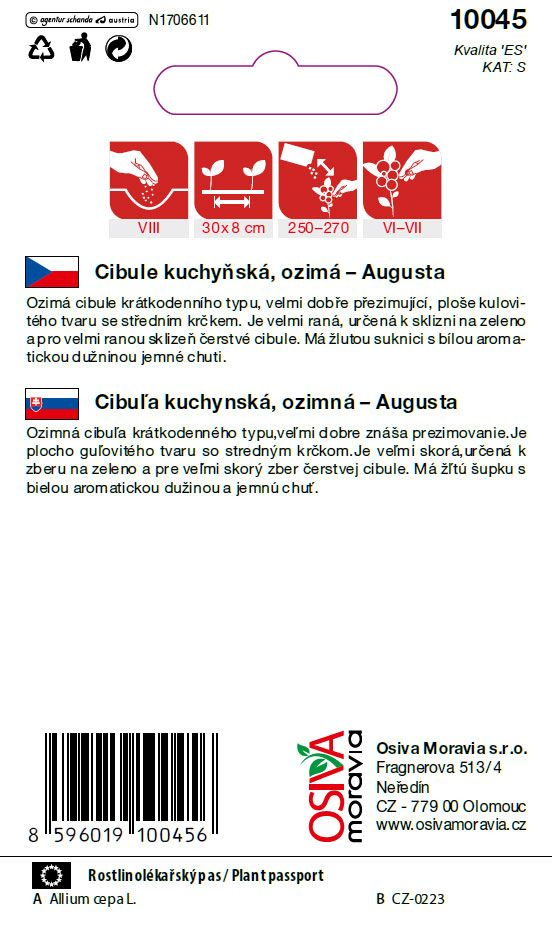Cibule kuchyňská Augusta je ozimní odrůda krátkodenního typu, která se vyznačuje výbornou odolností vůči zimním mrazům. Cibule má plocho kulovitý tvar se středním krčkem, žlutou slupku a bílou, jemně aromatickou dužninu. Tato velmi raná odrůda je ideální pro sklizeň zelené cibulky i pro ranou sklizeň čerstvé cibule.