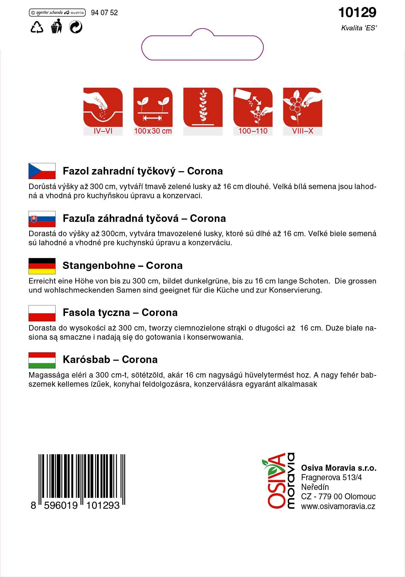 Fazol zahradní tyčový - CORONA je popínavá odrůda, která dorůstá do výšky až 300 cm. Tento fazol se vyznačuje tmavě zelenými lusky o délce až 16 cm, které obsahují velká bílá semena. Semena jsou lahodná a vhodná pro různé kuchyňské úpravy i konzervování. Rostlina vyžaduje oporu k popínání, slunné stanoviště a dobře propustnou půdu. Během pěstování je nezbytná pravidelná zálivka, zejména v období květu a tvorby lusků.