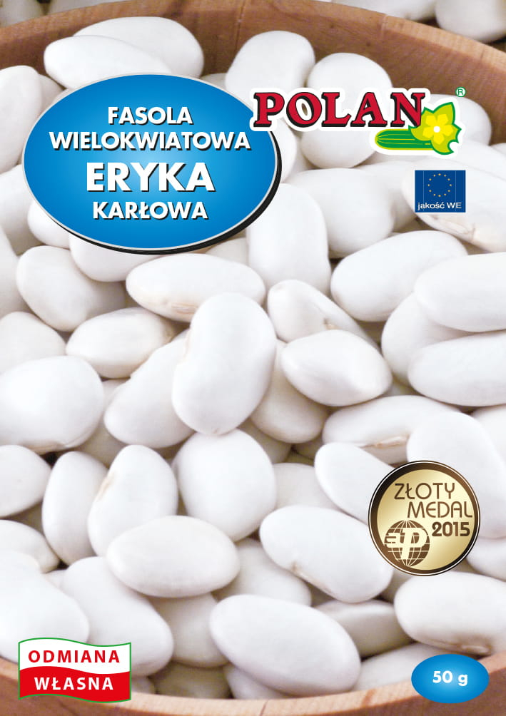 Fazol mnohokvětý ERYKA je středně raná keříčková odrůda s výškou 50 cm, určená pro suchá semena. Vyznačuje se výjimečnou chutí a vysokou kvalitou. Semena jsou bílá, hladká a ledvinovitého tvaru. V jednom lusku se nachází přibližně 4-5 semen. Hmotnost 1000 semen je přibližně 1600-1800 g. Tato odrůda je ideální volbou pro pěstitele, kteří hledají spolehlivou a chutnou fazoli na suché použití.