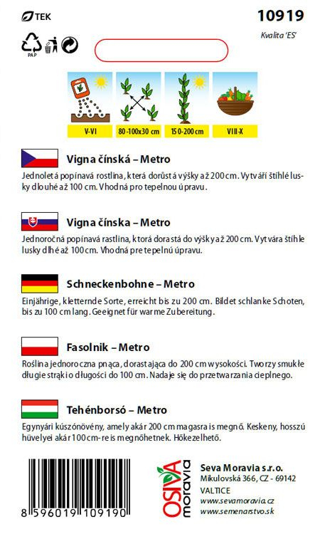 Vigna čínská je teplomilná luskovina s veľmi dlouhými, tenkými lusky, které mohou dorůstat i přes 40–60 cm. Od běžných fazolí se liší hlavně tvarem a délkou lusků, ale i jemnější chutí. Odrůda METRO patří mezi popínavé typy, takže vyžaduje oporu a dobře využívá výšku záhonu nebo skleníku. Při vhodných podmínkách vytváří množství dlouhých lusků, které jsou nejchutnější v mladém stadiu. Rostliny dobře reagují na teplo a dostatek slunce, v chladnějších oblastech se preto často pestujú v skleníku nebo fóliovníku. V kuchyni se vigna čínská používá podobně jako zelené fazolky, ale na talíři pôsobí exotičtějším a efektnějším dojmom. Je vhodná pro zahrádkáře, kteří chtějí zkusit netradiční, exotickou zeleninu s bohatou úrodou.