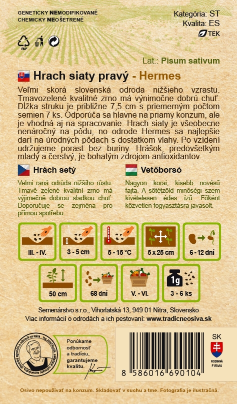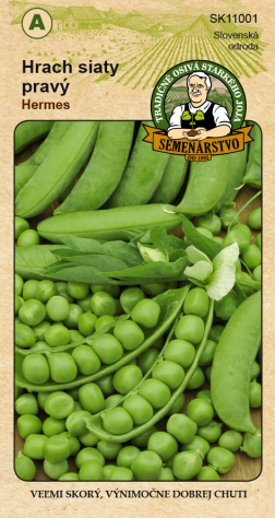 Raná slovenská odrůda nižšího vzrůstu, pojmenovaná po antickém bohu plodnosti Hermesovi. Název odrůdy napovídá, že se jedná o úrodný kultivar s délkou lusku přibližně 7,5 cm a průměrným počtem semen 7 ks. Doporučuje se hlavně k přímé konzumaci, ale je vhodný i ke zpracování či mrazení. Nevyžaduje příliš kvalitní půdu, ale potřebuje dostatek vláhy. Po vyklíčení je nutné udržovat půdu bez plevele. Hrách Hermes je bohatým zdrojem antioxidantů podporujících zdraví.