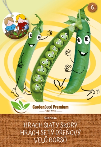 Hrách setý raný – Gloriosa pro děti je speciální edice navržená k přiblížení dětí zahradničení. Tato raná odrůda má velká, tmavě zelená semena a lusky dlouhé 8–9 cm. Rostlina dorůstá výšky 60–70 cm a je ideální pro ruční sběr. Skvěle se hodí k mražení a je nenáročná na pěstování, což z ní činí ideální volbu pro začátečníky a děti.