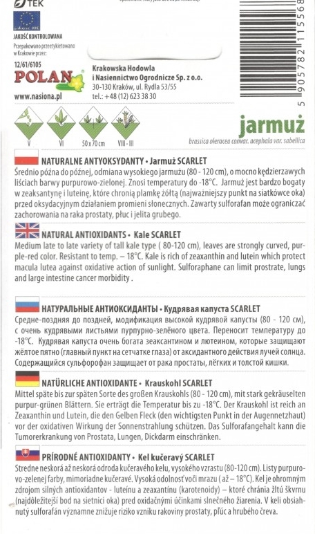 Kadeřávek SCARLET Antioxidant je středně pozdní až pozdní odrůda kadeřávku, dorůstající výšky 80 - 120 cm. Listy mají purpurově zelenou barvu a jsou mimořádně kadeřavé. Tato odrůda vyniká vysokou odolností vůči mrazu až do -18 °C. Kadeřávek je bohatým zdrojem silných antioxidantů - luteinu a zeaxanthinu (karotenoidy) - které chrání žlutou skvrnu na sítnici před oxidačním poškozením. Obsah sulforafanu pomáhá snižovat riziko vzniku rakoviny prostaty, plic a tlustého střeva.