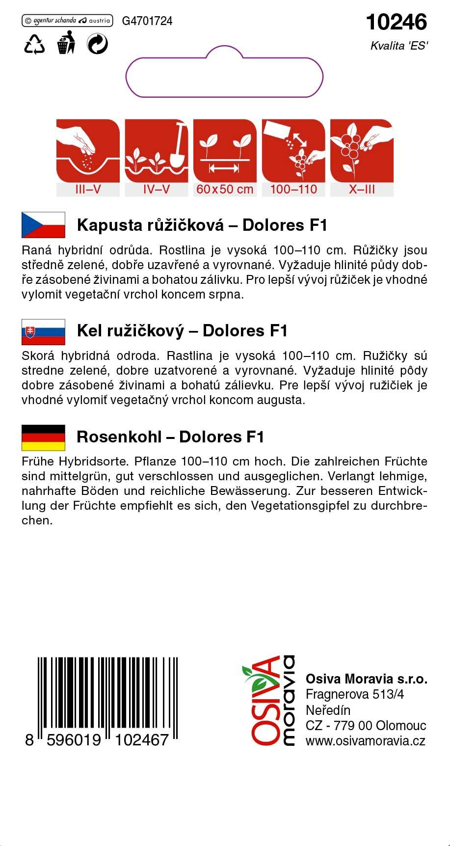 Růžičková kapusta Dolores F1 je raná hybridní odrůda, která dosahuje výšky 100 - 110 cm. Růžičky jsou středně zelené, dobře uzavřené a vyrovnané, což zajišťuje jejich vysokou kvalitu. Tato odrůda vyžaduje hlinité půdy bohaté na živiny a dostatečnou zálivku, zejména během sušších období. Pro lepší vývoj růžiček se doporučuje vylomit vegetační vrchol rostliny koncem srpna.