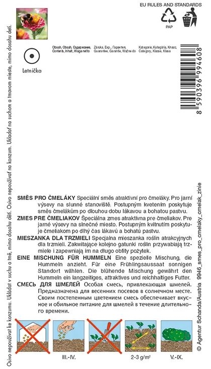Směs květin pro čmeláky je pečlivě sestavená kombinace letniček a trvalek, jejímž cílem je vytvořit přirozené a stabilní prostředí pro užitečný hmyz. Tato víceletá směs obsahuje široké spektrum druhů, jako jsou svazenka, měsíček, ostálka, brutnák, krásenka či jetel, které kvetou postupně. Díky tomu mají čmeláci a včely zajištěn přísun nektaru po celé vegetační období. Směs je ideální pro vytvoření kvetoucích pásů, divokých koutů zahrad nebo přírodních luk, které nevyžadují náročnou údržbu a každý rok mění svou barevnou tvář.