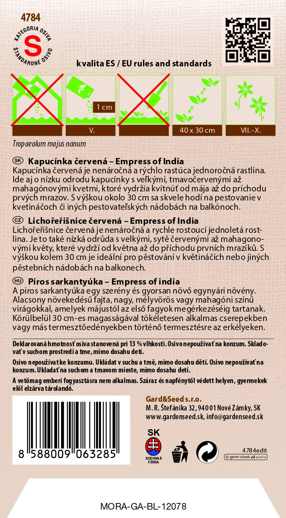 Tagy : lichořeřišnice, lichořeřišnice červená, Empress of India, jedlé květy, nízké letničky, pěstování v květináčích, balkonové květiny, nenáročné rostliny, mahagonové květy, léčivé bylinky, květy pro včely, rychlerostoucí letničky, dekorace jídel, Tropaeolum majus, semena květin