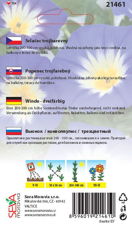 Tagy : svlačec, svlačec trojbarevný, modré květy, letnička, semena květů, balkonové květiny, krycí rostlina, záhonová rostlina, Convolvulus tricolor, modrý s bílým středem, okrasná zahrada, výsev v květnu, kvetení v létě, osivo, Seva Moravia