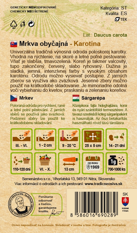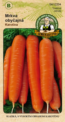 Mrkev obyčejná KAROTINA tvoří rovné až mírně válcovité kořeny sytě oranžové barvy, s jemným jádrem a přirozeně sladkou chutí. Kořen má délku přibližně 13 cm a vyznačuje se jemnou dužninou a vysokým obsahem vitamínů a minerálů. Vyniká vysokým obsahem beta-karotenu, hodí se proto skvěle na zdravé šťávy i každodenní vaření. Vhodná pro raný i postupný výsev.