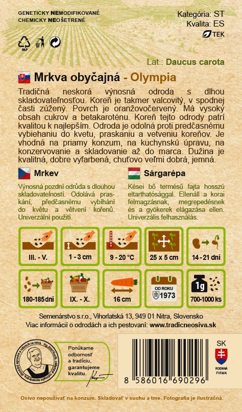 Mrkev obyčejná OLYMPIA dává vyrovnané, válcovité a hladké kořeny se sytě oranžovou dužninou a jemným jádrem. Kořen má délku přibližně 16 cm a obsahuje vysoký podíl cukrů a betakarotenu, což ji řadí mezi odrůdy s nejvyšší kvalitou. Vyniká příjemně sladkou chutí a univerzálním použitím – pro čerstvou spotřebu, šťávy, vaření i kratší skladování.