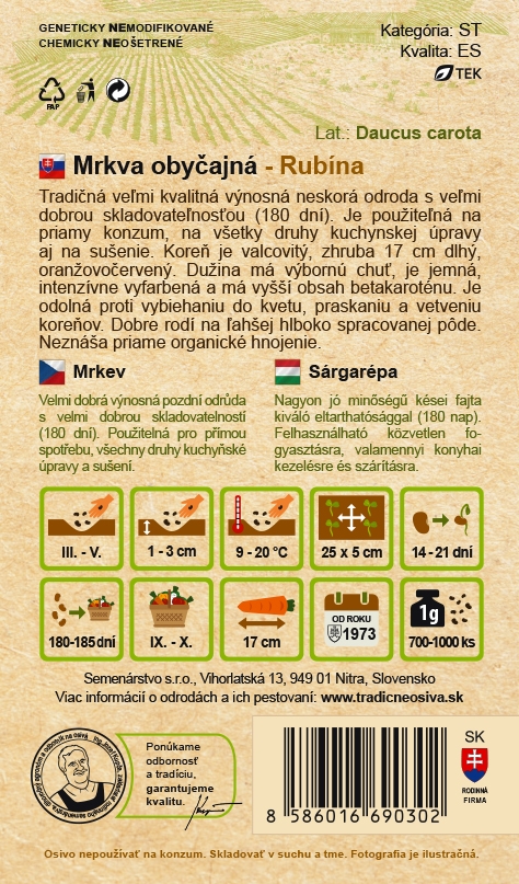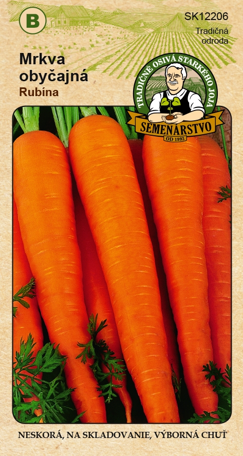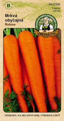 Mrkev Rubina je prověřená odrůda pro přímý výsev se sladkou chutí a sytě oranžovou barvou. Vytváří vyrovnané, hladké kořeny válcovitého až jemně kónického tvaru vhodné pro čerstvou konzumaci i kuchyňské zpracování. V záhoně dává uniformní porost, takže se snadno pěstuje i méně zkušeným pěstitelům. Odrůda je stabilní ve výnosu a dobře reaguje na rovnoměrnou vláhu půdy. Hodí se na svazkování, strouhání, šťávy i dětská pyré. Při dobré péči poskytuje hladké, rovné kořeny příjemné křehkosti. Má nízkou tendenci k vybíhání do květu a zvládá letní pěstování. Výhodou je i spolehlivé vzcházení ve vhodně připravené půdě.