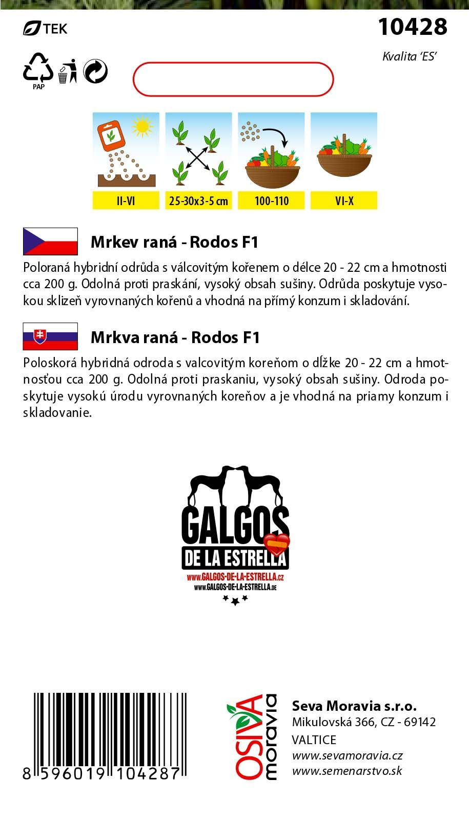 Mrkev raná RODOS F1 je hybridní odrůda, speciálně vyšlechtěná pro ranou produkci. Vyznačuje se krátkou vegetační dobou a vysokou odolností vůči chorobám. Kořeny jsou rovné, s intenzivní oranžovou barvou, šťavnaté a sladké, což je činí ideálními pro čerstvou konzumaci. Odroda RODOS F1 je oblíbená pro svou uniformitu a konzistentně vysokou kvalitu kořenů, které dozrávají současně, což výrazně usnadňuje sklizeň.