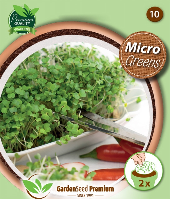 Vysévejte hustě na navlhčený sterilní substrát nebo pěstební rohož. Po výsevu 48–72 hodin zastínit (blackout) pro rovnoměrné vzcházení, poté dopěstovat na světle bez přímého slunce při 18–22 °C. Udržujte stálou, nikoli přemokřenou vlhkost – ideální je spodní zálivka; listy zbytečně nerosit. Pro prevenci zahnívání zajistěte cirkulaci vzduchu. Sklízejte nůžkami pár mm nad povrchem, propláchněte a osušte.