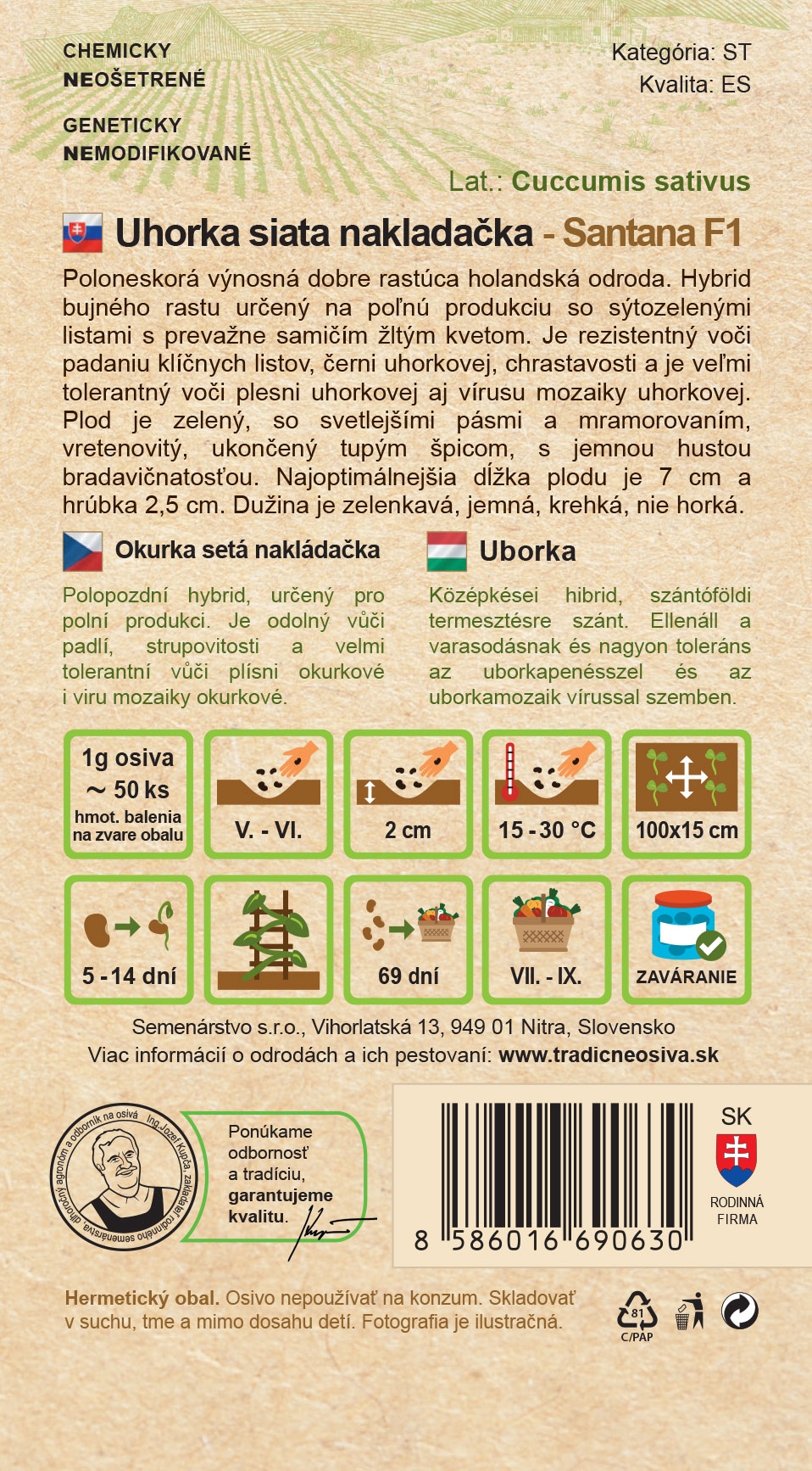 Okurka setá nakládačka Santana F1 je polopozdní, výnosná holandská hybridní odrůda s bujným růstem, určená pro polní produkci. Rostlina má sytě zelené listy a převážně samičí žluté květy. Je rezistentní vůči padání děložních lístků, černi okurkové, strupovitosti a velmi tolerantní vůči plísni okurkové i viru mozaiky okurek. Plody jsou zelené, se světlejšími pruhy a mramorováním, vřetenovitého tvaru s jemnou hustou bradavičnatostí. Optimální délka plodu je 7 cm a šířka 2,5 cm. Dužina je jemná, křehká, zelenkavá, bez hořkosti a zakončená tupou špičkou. Semena nejsou chemicky ošetřena a nejsou geneticky modifikována.