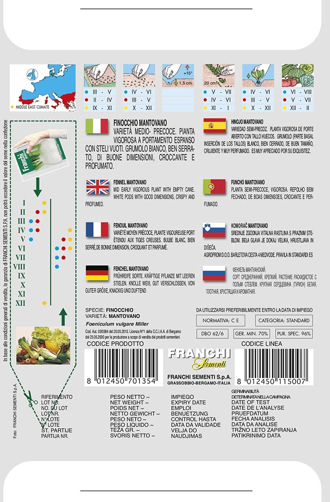Fenykl Mantovano se nejčastěji vysévá od konce jara do poloviny léta, aby se omezilo vybíhání do květu při dlouhém dni. Semena se vysévají přímo na záhon do řádků asi 1–2 cm hluboko. Po vzejití je nutné rostlinky vyjednotit na vhodný spon, aby měly dostatek prostoru pro tvorbu hlíz. Obvykle se nechává rozestup kolem 25–30 cm mezi rostlinami. Půda by měla být kyprá, výživná a rovnoměrně vlhká. V suchých obdobích je důležitá pravidelná zálivka, aby se růst nezpomalil. Správně načasovaný výsev zajistí pevné a chutné hlízy bez dřevnatění.