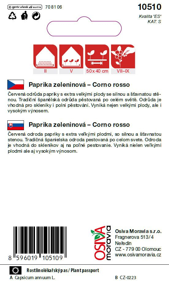 Paprika Corno Rosso je tradiční španělská odrůda, která si získala oblibu u zahradníků po celém světě. Je charakteristická svými extra velkými plody podlouhlého tvaru, které připomínají býčí roh. Tyto plody mají silnou, masitou a mimořádně šťavnatou stěnu, což z nich dělá ideální volbu nejen pro přímou konzumaci a do čerstvých salátů, ale také pro grilování či konzervování. Odrůda vyniká vysokou výnosností a stabilitou v různých pěstitelských podmínkách.