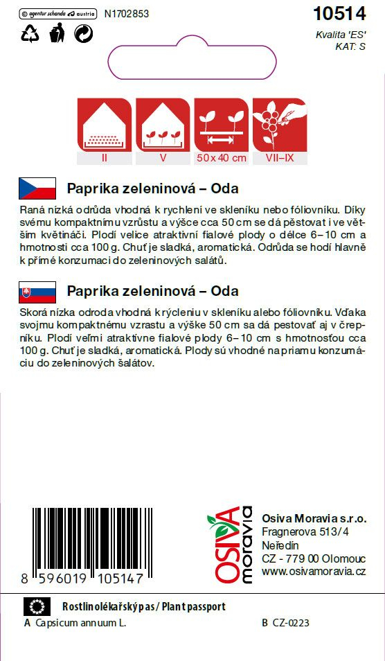 Paprika zeleninová - pálivá ODA je známá italská odrůda papriky, která je známá svou výraznou chutí a střední až vysokou úrovní pálivosti. Tato odrůda je ideální pro pěstitele, kteří si chtějí vychutnat ostrou chuť doma pěstované papriky. Vyznačuje se velmi atraktivními fialovými plody, které dorůstají do velikosti 6 - 10 centimetrů. Vzrůst rostliny umožňuje tuto odrůdu pěstovat i ve větším květináči na terase či balkóně.