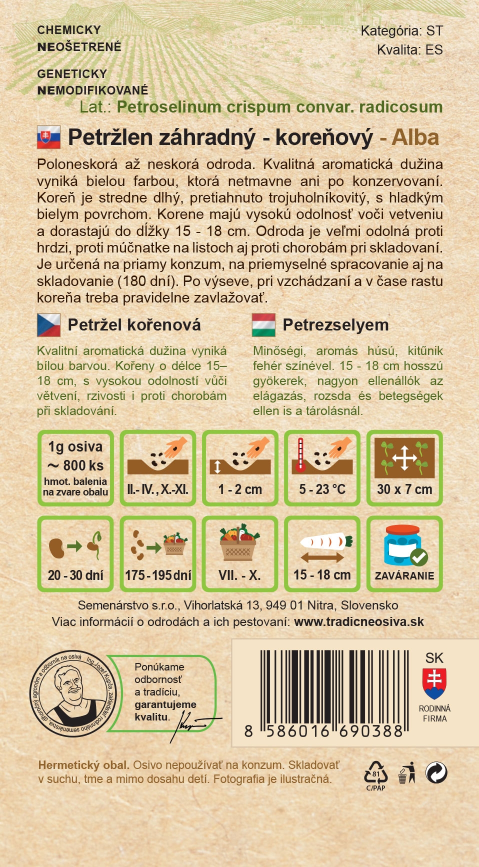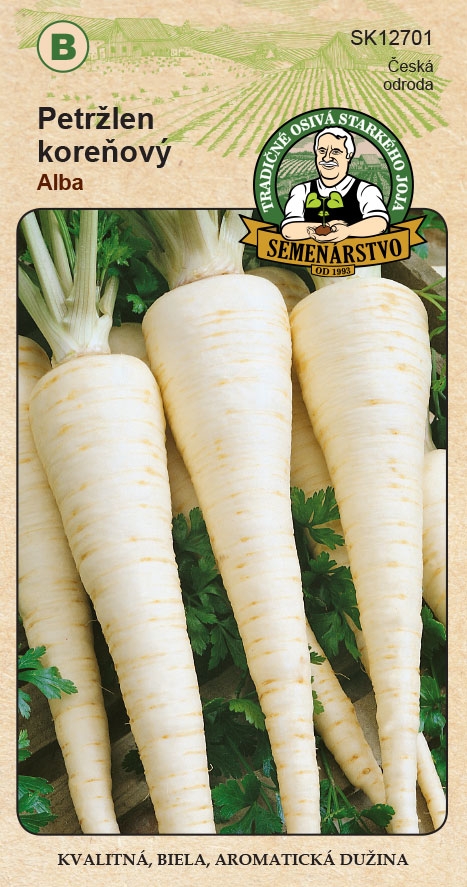 Zahradní petržel Alba je oblíbená odrůda díky svým dlouhým, rovným a sněhobílým kořenům, které mají jemnou, aromatickou dužninu. Kořeny jsou pevné, nepřecházejí do dřevnatosti a dobře drží tvar při vaření. Alba poskytuje vysoké a vyrovnané výnosy a je vhodná jak pro domácí zahrady, tak i pro menší tržní produkci. Silná nať usnadňuje sklizeň a dá se využít jako běžná kuchyňská bylinka. Výhodou je aj skvělá skladovatelnost, díky které lze kořeny uchovat celou zimu bez výraznej straty kvality.
