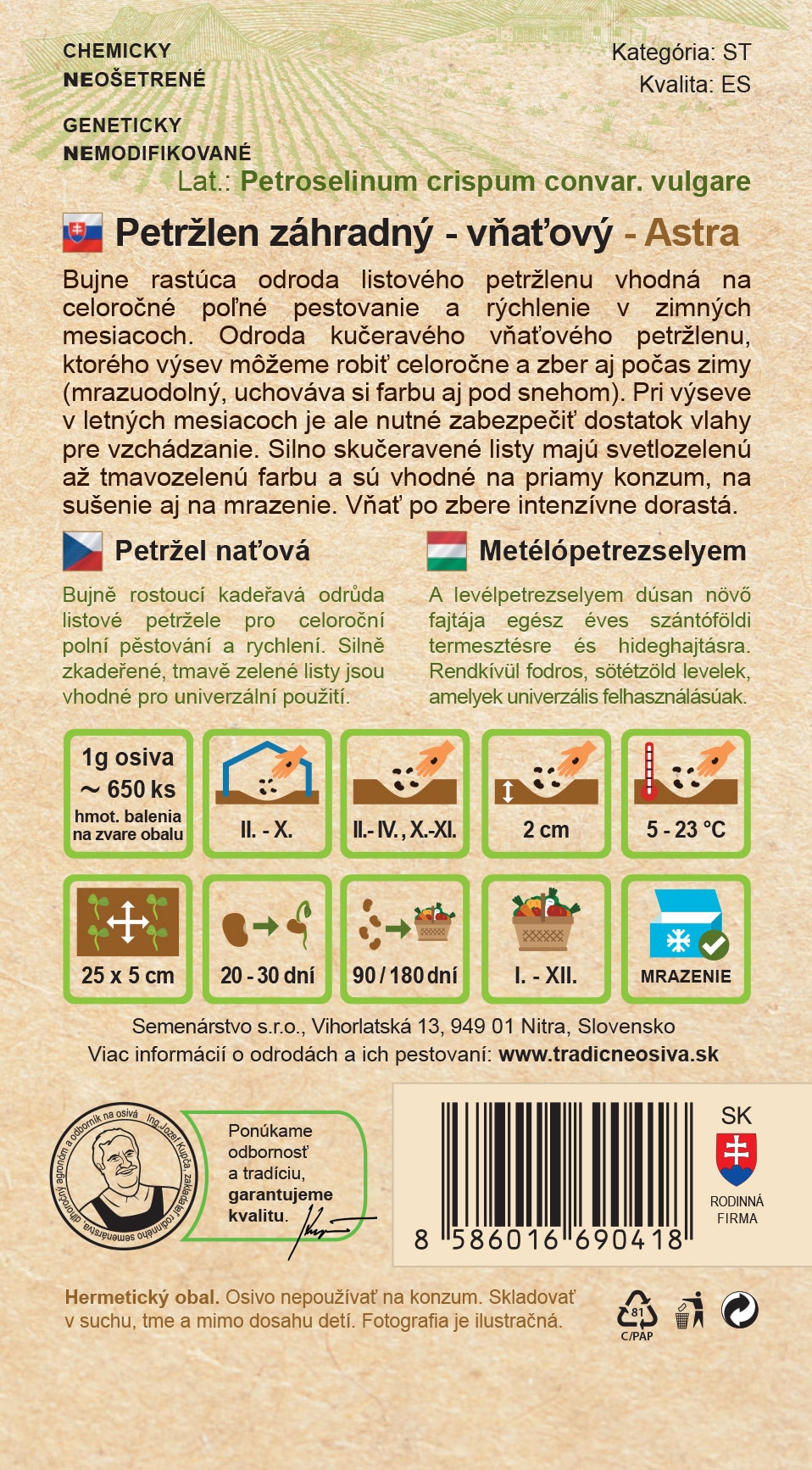 Petržel zahradní naťový Astra je bujně rostoucí odrůda kudrnatého listového petržele, ideální pro celoroční polní pěstování a rychlení během zimních měsíců. Tato odrůda je mrazuvzdorná a zachovává si barvu i pod sněhem. Při výsevu v letních měsících je nutné zajistit dostatek vláhy pro úspěšné vzcházení. Silně zkadeřené listy mají světle zelenou až tmavě zelenou barvu a jsou vhodné pro přímou konzumaci, sušení i zmrazování. Po sklizni nať rychle dorůstá, což umožňuje nepřetržitou sklizeň po celý rok.