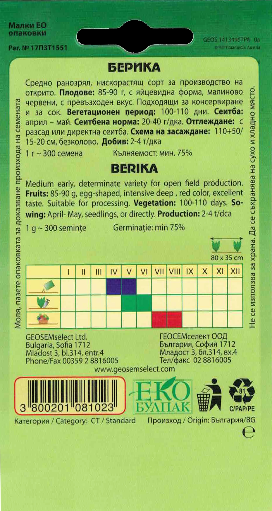 Rajče bulharské BERIKA F1 je poloraná nízká (determinantní) odrůda vhodná pro polní pěstování. Jedná se o vysoce výnosnou keříčkovou odrůdu s vysokým obsahem lykopenu a vitamínů, ideální pro konzervování, výrobu šťáv i přímou konzumaci. Plody jsou sytě červené, vejčitého tvaru, s hmotností 85 - 90 g. Mají jemnou slupku, vysoký obsah sušiny a dlouho si uchovávají svou chuť a vzhled po sklizni.