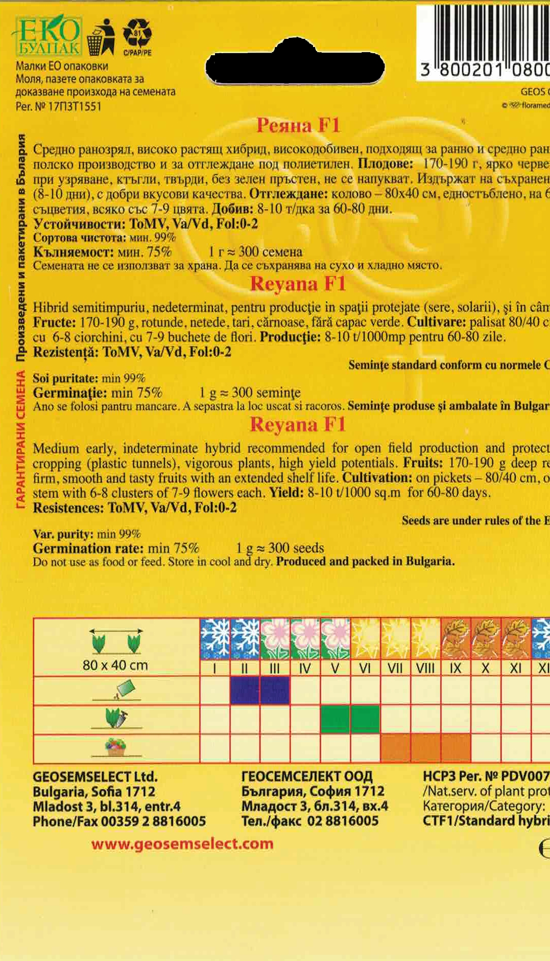 Rajče REYANA F1 vyséváme od února do března. Sazenice přesazujeme na stálé stanoviště v květnu až červnu, doporučujeme spon 80 x 35 cm. Rostlina vyžaduje oporu pro zajištění správného růstu. Sklizeň probíhá od července do září. Odrůda je ideální pro pěstování na otevřených plochách i ve fóliovnících.
