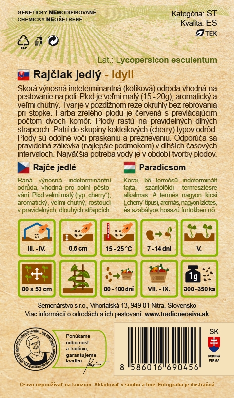 Rajče Idyll vyséváme do skleníku od března do dubna do hloubky 0,5 cm. Sazenice přesazujeme na trvalé stanoviště v květnu s doporučeným sponem 80 x 50 cm. Rostlina preferuje slunné stanoviště a humózní, propustnou půdu. Při pěstování zajišťujeme oporu pro tyčkový růst. Pravidelná zálivka podporuje zdravý růst a bohatou úrodu. Plody sklízíme od července do září, 80 - 100 dní po výsevu.