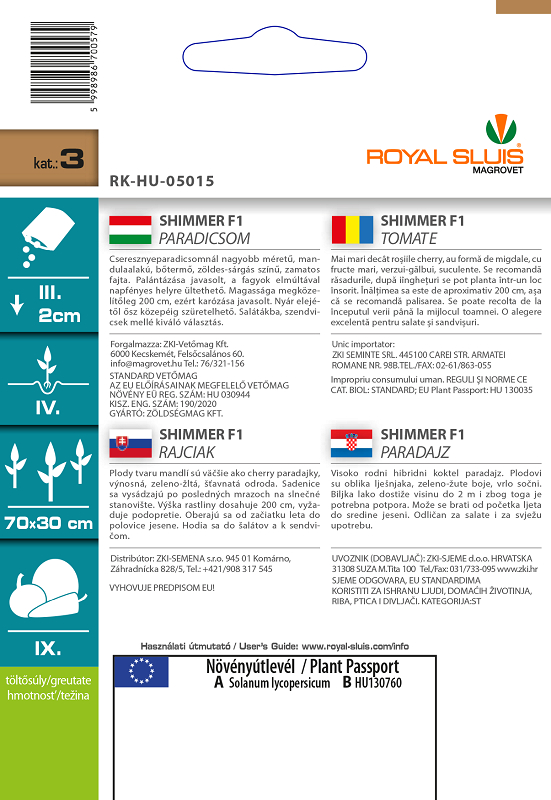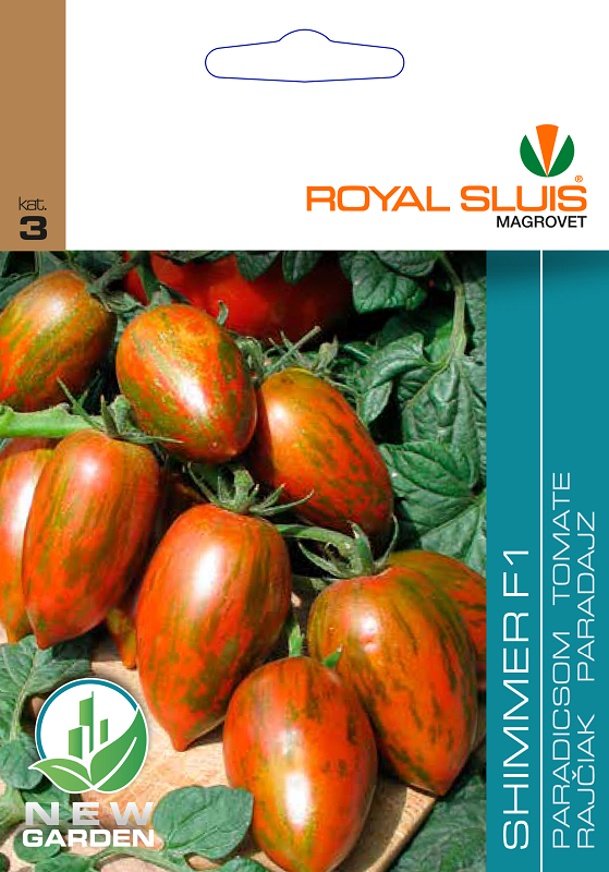 Rajče Shimmer F1 je velká šťavnatá odrůda mandlového tvaru, která je větší než cherry rajčata a má zelenožlutou barevné flekyna pokožce, co ji dělá mimořádne atraktivní. Doporučuje se její předpěstování a po odeznění mrazů výsadba na slunné místo. Rostlina dosahuje výšky přibližně 200 cm, proto je vhodné ji vyvazovat k opoře.