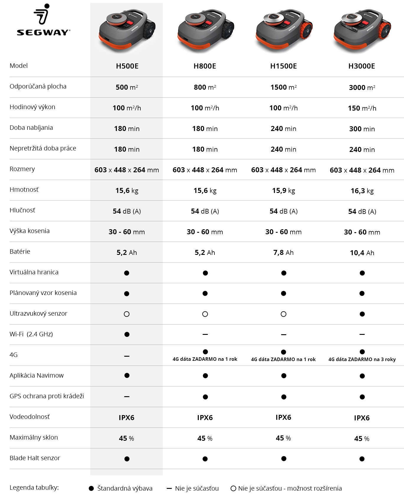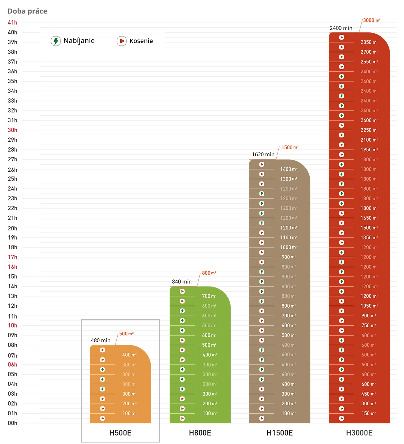 Doba nabíjení, hodinový výkon a pracovní účinnost se u jednotlivých modelů liší. Pro výběr vhodného modelu pro vaši velikost trávníku se podívejte do níže uvedené tabulky. Model H1500E zvládne posekat trávník o rozloze 1500 m2 přibližně za 8 hodin.