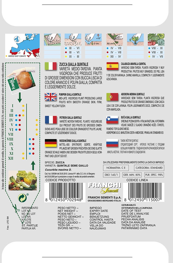 Dýně QUINTALE SEME GIALLO je středně pozdní odrůda, která produkuje množství velkých a hladkých plodů. Rostlina je velmi bujná, plody jsou velkých rozměrů, s masitou a jemnou dužinou sladší chuti. Tato odrůda je ideální pro různé kuchyňské úpravy díky své výjimečné chuti a textuře.
